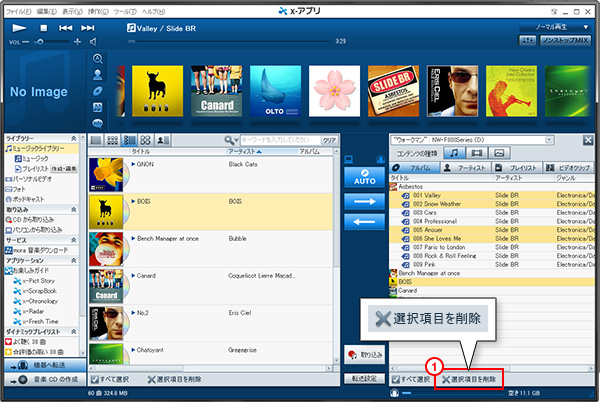ウォークマンから削除したいアルバム・楽曲をクリックして、選択してください。