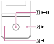 再生中または前の曲の頭出しをする。長押しすると、早戻しをする。 |