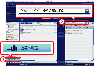 画面右側のプルダウンメニューをクリックし、転送先の“ウォークマン”を選択します。
