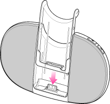 同梱のスピーカーには“ウォークマン”用アタッチメントがセットされています。アタッチメントがはずれてしまった場合は、イラストのようにスライドさせてカチッと音がするまで同梱のスピーカーにセットしてください。