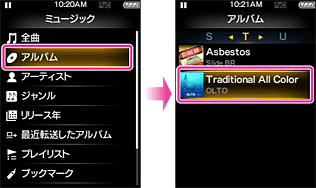 」ボタンで[全曲]、[アルバム]、[アーティスト]などから、お好きな検索方法を選んで「