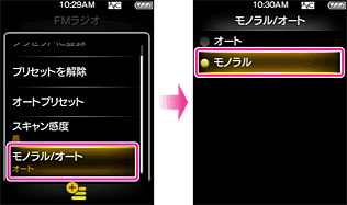 FMラジオ放送を受信中に電波が弱いなどの理由により、雑音が多いときは、「モノラル/オート」の設定を手動で「モノラル」にしてください。「オート」に設定してある場合は、ステレオとモノラルは受信時の状態によって自動的に設定されます。