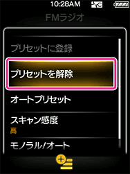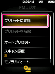 FMラジオ画面でOPTION/PWR OFFボタンを押すと、オプションメニューが表示されます。