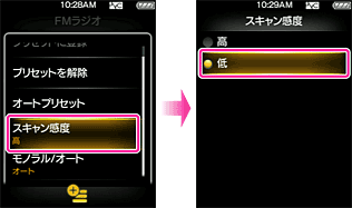 オートプリセットで放送局をスキャンするに、受信感度が強すぎて不要な放送局を受信してしまう場合があります。このようなときは、スキャン感度を「低」に設定してください。