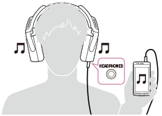 電源を切ってから、“ウォークマン”をヘッドホンケーブルで他のプレーヤーとつなぐと、プレーヤーの音楽をヘッドホンで聞くことができます。