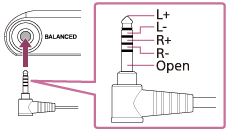 - バランス標準プラグのヘッドホンを接続します。カチッと音がするまで奥へ差し込んでください。