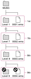 コンテンツやコンテンツの入ったフォルダーは、次の階層のように正しくドラッグアンドドロップしてください。第一から第八階層までのコンテンツが再生できます。