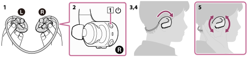)を3秒長押しして、ウォークマンの電源を入れる。 - ネックバンドを耳と頭の間に上からかける。