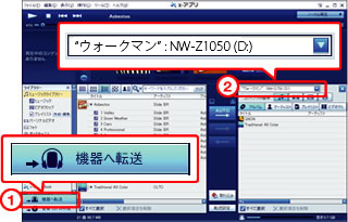 画面右側のプルダウンメニューをクリックし、転送先の"ウォークマン"を選びます。