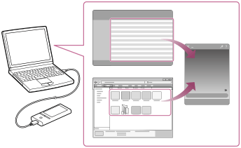Macパソコンにあるコンテンツや、iTunesで管理しているコンテンツやプレイリストを、Content Transferを使ってウォークマンに転送します。著作権保護されたコンテンツは転送できません。