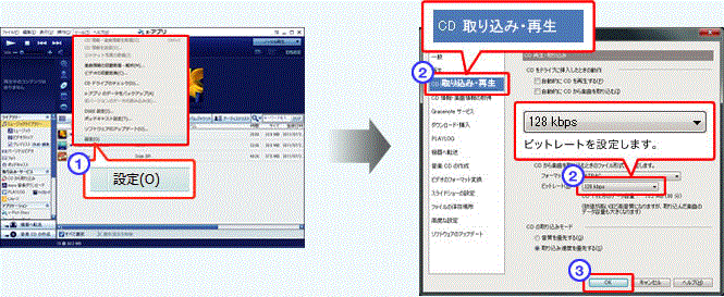 [CD取り込み・再生]を選び、[ビットレート]を指定してください。