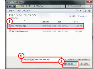右の図では例として、「ミュージック」フォルダーの「マイアルバム」から楽曲ファイルを選択しています。