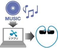 CDの音楽を“ウォークマン”で聴くには、「x-アプリ」を使い音楽CDの曲をパソコンへ取り込んだあとで、“ウォークマン”へ転送します。