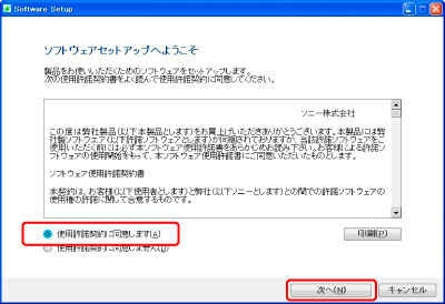 “ウォークマン”に同梱されているCD-ROMをパソコンに挿入すると、“ソフトウェアセットアップへようこそ”画面が表示されます。