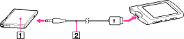 “ウォークマン”とオーディオ機器を、別売りの録音用アクセサリーを使って接続すると、パソコンを介さずに“ウォークマン”で直接MDプレーヤーなどから曲を録音することができます。録音する前に“ウォークマン”を充分に充電してください。