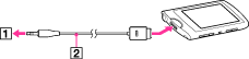 別売りの録音用ケーブル(WMC-NWR1)を“ウォークマン”のWM-PORTジャックに接続し、オーディオ機器のヘッドホンジャックに接続する。