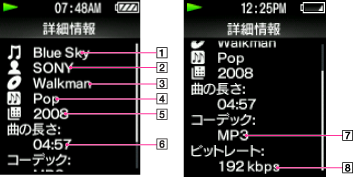 曲の再生時間、音楽ファイル形式、ビットレート、ファイル名などが表示されます【詳細】。