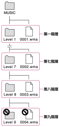 音楽などのコンテンツやコンテンツの入ったフォルダーは次の階層のように正しくドラッグアンドドロップしてください。