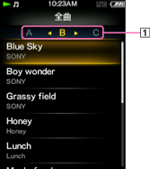 曲やアルバム、アーティスト名を、50音順やアルファベット順で頭文字を選んで、リスト画面の先頭に表示します。