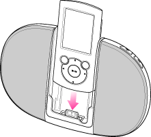 同梱のスピーカーには“ウォークマン”用アタッチメントがセットされています。アタッチメントがはずれてしまった場合は、イラストのようにスライドさせてカチッと音がするまで同梱のスピーカーにセットしてください。