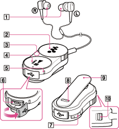 同梱のBluetoothヘッドホンの各部の名前(NW-S764BTのみ)