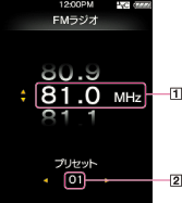 FMラジオ画面で、受信できる放送局の周波数やプリセット番号を選ぶことができます。