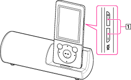 “ウォークマン”のVOL +/–ボタンで音量を調節する。
