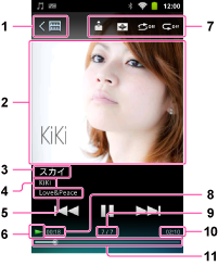 音楽再生画面では、曲の再生を操作したり、情報を表示・検索したりすることができます。