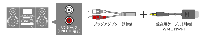 録音したい音源をオーディオ再生機器へセットし、別売の録音用ケーブルでウォークマンと接続して録音を行います。