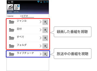 録画した番組や放送中の番組を視聴するには、以下のいずれかのフォルダーをタップしてください。