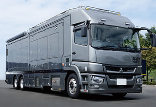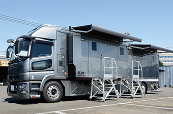 当社ではゴルフ・野球・サッカーなど、主にスポーツを中心とした中継業務を行っています。今後、さらに大規模な中継や音楽収録に対応するべく今回増備した「X-01」(エックス・ゼロワン)は、いままでの流れをすべて一新する新世代中継車と位置付けています。