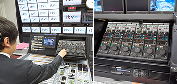 放送・業務用有機ELモニターも多数導入、運用されています。スイッチャー卓(写真・左)、VE卓(写真・中央)にPVM-A250/A170、ほかに素材モニターとしてPVM-741、カメラのビューファインダーとしてHDVF-EL75/EL70(写真・右)を採用し、一貫した高精細な画像で情報を共有し、効率的なオペレーションを実現しています。