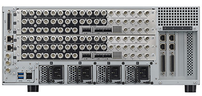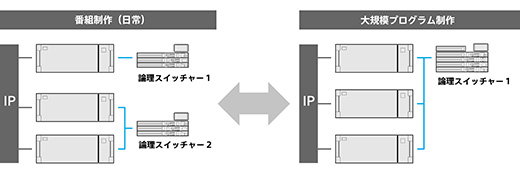 4Uサイズのプロセッサーユニットをシステム規模に合わせて、最大5台まで積み重ねることが可能です。複数のスイッチャー構成やユニットの追加・拡張にも柔軟に対応できます。例えば、3台の『MLS-X1』を通常は2台と1台の構成で2つのスイッチャーとして使用しながら、大規模プログラムのときには3台を1つのスイッチャーとして使用することができます。将来的にユニットを追加して、システム拡張することも容易です。