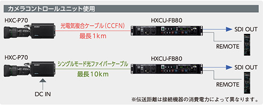 カメラ単体での運用だけでなく、カメラコントロールユニットHXCU-FB80と接続して、システム運用することも可能です。CCUから電源供給時には最長1km、シングルモード光ファイバーケーブル接続時には最長10kmの長距離伝送が可能になります。