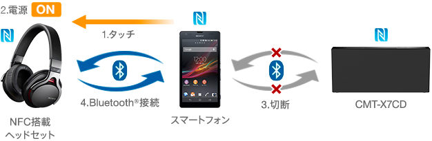 CMT-X7CDとBluetooth接続中のNFC搭載のスマートフォンや、おサイフケータイ(R)対応Android(TM)搭載スマートフォンなどをCMT-X7CD以外のヘッドセットなどのNFC搭載機器にタッチすると、CMT-X7CDとのBluetooth接続を切断し、ヘッドセットとBluetooth接続が完了します。
