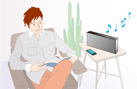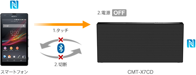 NFC搭載のスマートフォンや、おサイフケータイ(R)対応Android(TM)搭載スマートフォンなどをCMT-X7CDにタッチするとCMT-X7CDの電源がONになり、Bluetooth接続が完了します。