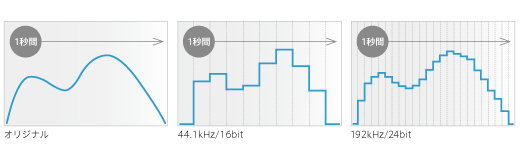 一般的なデジタル音源は、原音(アナログ音源)を一定時間ごとにサンプリング(標本化)することで作られます。1秒間ごとに切り取る回数をサンプリング周波数と言い、単位は「Hz」です。音の強弱(ダイナミックレンジ)は各信号の大きさを0と1の2進数で表現(量子化)するもので、単位は「bit」です。それぞれ、その数値が大きいほど、原音(アナログ音源)に近いデジタル信号と言えます。