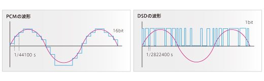 ハイレゾ音源では、CDの「44.1kHz/16bit」規格を超えるものを指し、「96kHz/24bit」と「192kHz/24bit」が主流になっています。アナログ信号をデジタル化するこの手法をPCM(pulse code modulation)方式またはリニアPCMと呼んでいます。また、デジタルに変換する別の手法としてDSD(Direct Stream Digital)方式もあります。スーパーオーディオCD(SA-CD)に採用された1ビットデルタシグマ変調のデジタル記録方式で、サンプリング周波数はCDの64倍の2.8224MHzや128倍の5.6648MHzがあります。DSDはPCM方式よりもよりアナログ音源に近いデジタル記録ができることが特長です。