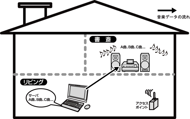 ネットジュークが既に通常のLANケーブル(ストレート)を使って、インターネット接続できている場合やホームネットワーク機能が使える場合は、離れた場所からもPC内の楽曲をHDDコンポへ高速転送(*2)できます。