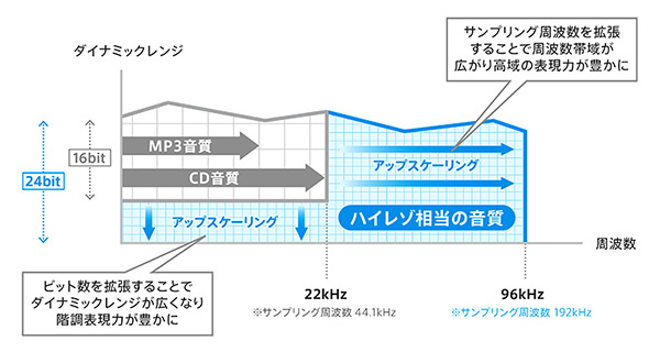 音楽CDやMP3に代表される圧縮音源など、あらゆる音源をハイレゾ相当の精細で臨場感あふれるサウンドにアップスケーリングしてくれる技術「DSEE HX」。圧縮やマスタリング時に失われた高域を補完しつつ、ビット数やサンプリング周波数をハイレゾ相当まで拡張し、豊かな階調表現と広がりのある高域を再現できるのだ