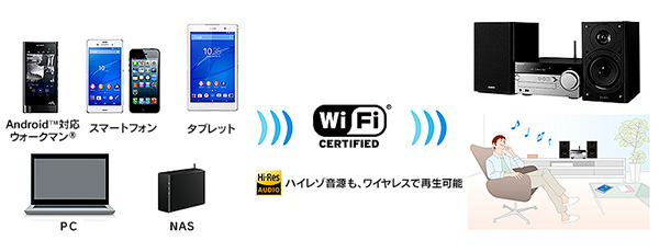Wi-Fiに対応した「CMT-SX7」は、パソコンやNAS、スマートフォン、ポータブルオーディオプレーヤーなどに保存したハイレゾ音源などを、ワイヤレスで音質劣化なく再生できる。実際に「NW-ZX2」内の音源を再生してみたが、音が途切れることもなく、ハイクオリティなサウンドを楽しめた。ちなみに、対応するハイレゾ音源のファイル形式は、DSD 2.8MHz(リニアPCM変換)のほか、WAV/FLAC/AIFF/ALACの192kHz/24bitまでとなる