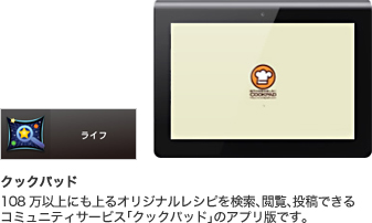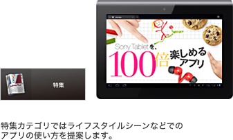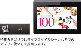おすすめのアプリを、エンターテインメント、ライフ、ビジネスなどのテーマ別に分類してカテゴリーごとに紹介。さらに特集カテゴリーでは、ライフスタイルシーンなどでのSony Tabletならではのアプリの楽しみ方をWebマガジン形式で提案します。