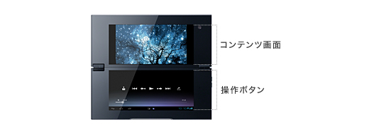 上画面にコンテンツを、下画面に操作ボタンを常時表示して視聴できるので、すぐに早送り・早戻しなどのコントロールが可能。また、下画面をオフにして消費電力を抑えることもできます。