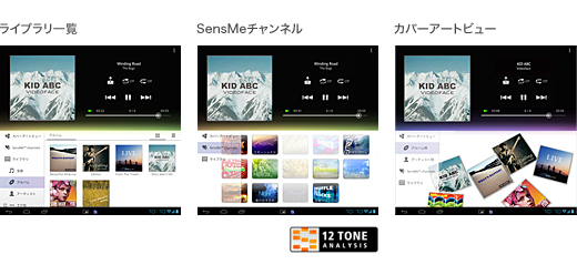 ■SensMe channels:ソニーの独自の12音解析技術により、Sony Tabletに保存した音楽を自動分類。チャンネルを選ぶだけで、そのときの気分やシーンにあった楽曲を楽しめます。