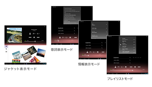 ジャケット表示モード、歌詞表示モード、情報表示モード、プレイリストモードの4種類の再生モードから好みにあわせて選べます。