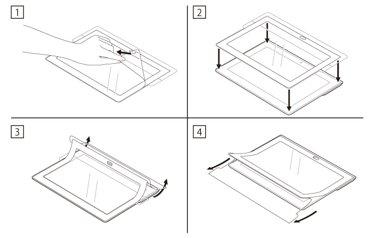 2. 液晶保護シートの黒枠の四隅を、タブレットデバイスにあわせて置く。