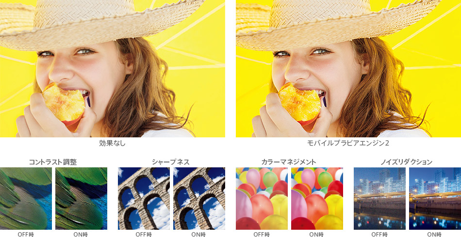 コンテンツの解像度に応じて自動で最適な効果をかけるモバイルブラビアエンジン2を搭載。映像の明るさの分布をリアルタイムで解析し、適切にコントラストを調整するので、より美しい映像を楽しめます。また、カラーマネジメントが進化し、人の肌は自然な肌色をキープしつつビビッドな色彩はあざやかに、くっきりと、各部分に最適なコントロールをかけられるようになりました。