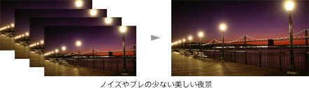 ノイズが出やすい暗い場所では、最大4枚の画像を重ね合わせて1枚に合成。ノイズを抑えた美しい写真が撮れます。