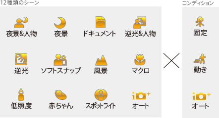 12種類のシーン認識に加え、被写体や撮影者の状況(コンディション)も認識。合計36パターンの組み合わせからカメラが最適な設定を自動で行うので、シャッターを押すだけできれいな写真を撮ることができます。