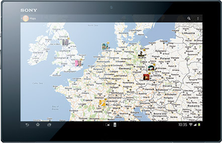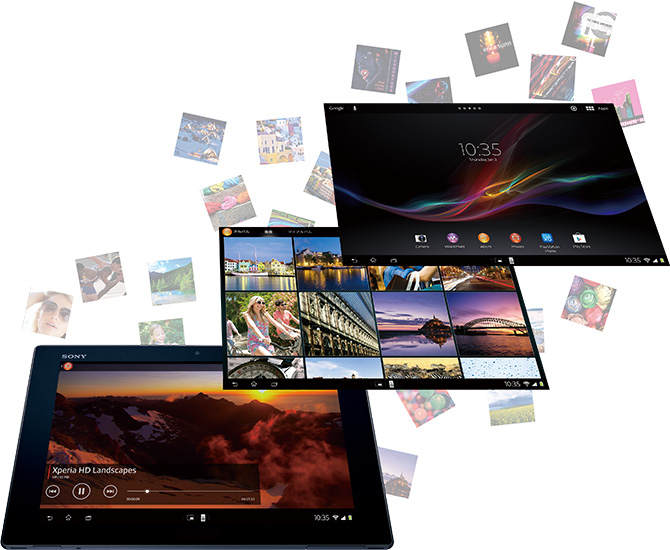 写真や動画の月別表示や地図上での撮影場所の表示ができ、ピンチ操作でコンテンツを素早く閲覧できる技術を搭載し、思い出の写真を快適に楽しめます。また、Facebookなどオンラインにアップされた画像をXperia™ Tablet Zのアルバムアプリケーションに同期でき、便利です。